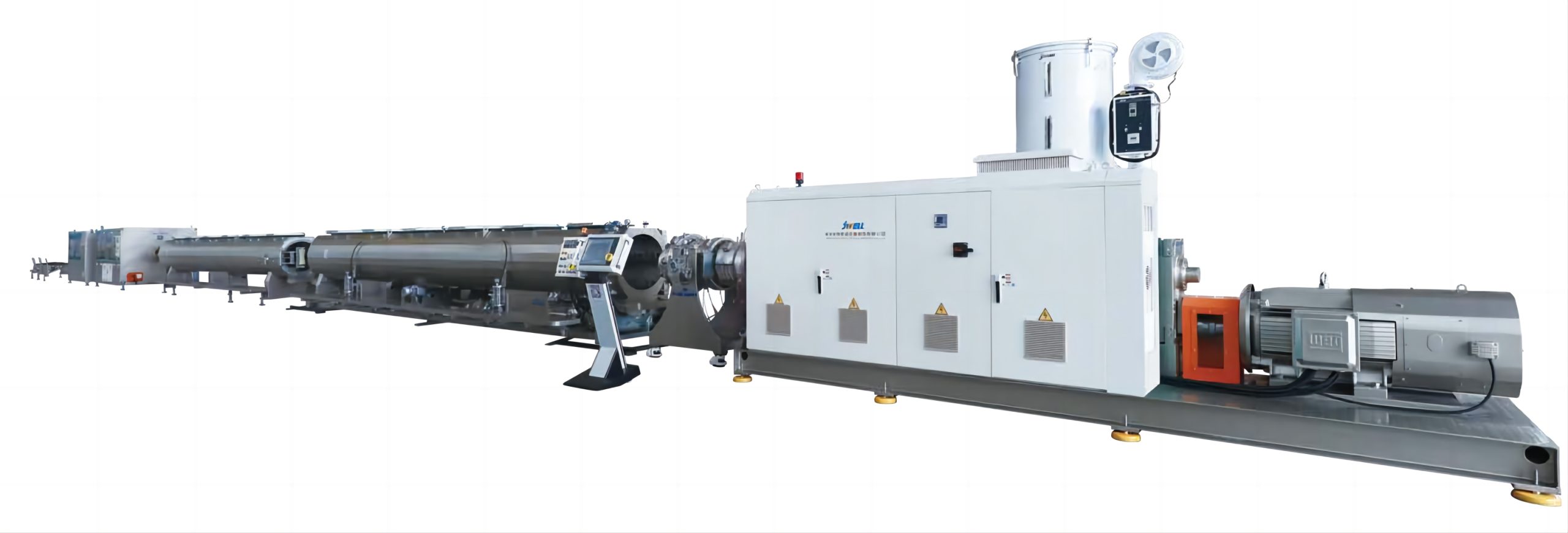 该生产线主要用于生产改性聚丙烯电缆导管,采用MPP专用螺杆和高扭矩变速箱。挤出模采用特殊流道设计,真空冷却槽采用变频控制。